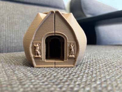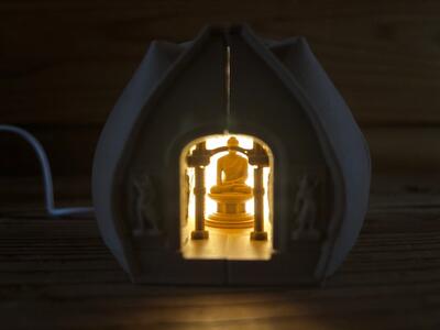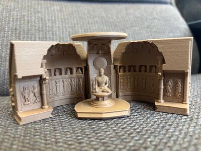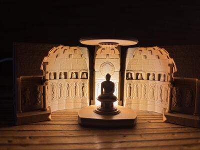 今回は、 韓国仁川の皆さんからいただいた記念品を紹介します。1つ目は、「国立中央博物館で販売されている石窟庵の照明」です。石窟庵の様子を3Dプリントで立体的に再現したミニチュア模型の照明で、中央から左右に開く構造になっています。(画像下段)