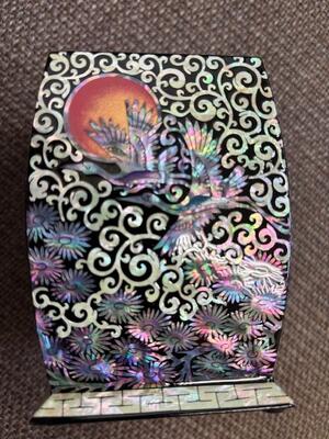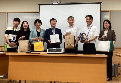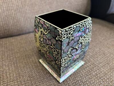 今回は、韓国仁川の皆さんからいただいた記念品の螺鈿漆器(らでんしっき)を紹介します。螺鈿漆器は貝殻(主にアワビ·サザエなど)の中皮を薄く削って木材の表面に貼り付け、うるしを何重にも塗り重ねて飾る伝統工芸品です。螺鈿特有の虹色が漆の深い黒色と調和し、ほのかで高級な光沢と合わさると芸術的な美しさがあります。本校からは地元高崎の福だるまをみなさん一人一人にプレゼントしました。