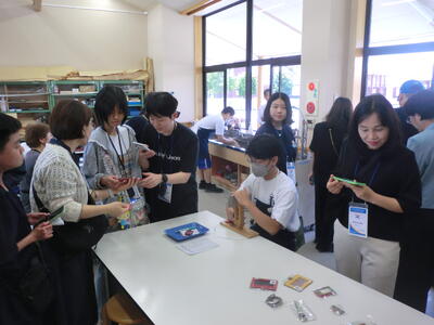 今回は、韓国仁川の皆さんからいただいた記念品の螺鈿漆器(らでんしっき)を紹介します。螺鈿漆器は貝殻(主にアワビ·サザエなど)の中皮を薄く削って木材の表面に貼り付け、うるしを何重にも塗り重ねて飾る伝統工芸品です。螺鈿特有の虹色が漆の深い黒色と調和し、ほのかで高級な光沢と合わさると芸術的な美しさがあります。本校からは地元高崎の福だるまをみなさん一人一人にプレゼントしました。