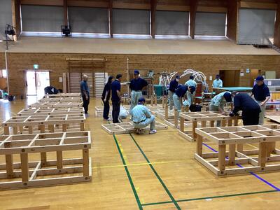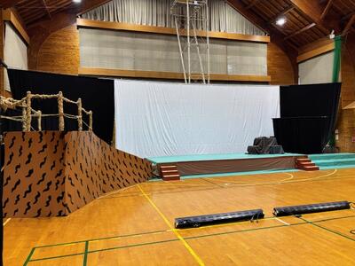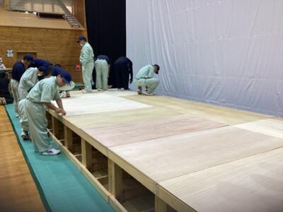 文化祭でのミュージカル発表に向けて、いよいよスクリーンや舞台の設置が行われました。毎年、工芸意匠科の生徒を中心に一つ一つ手作業で丁寧に組み立てられます。発表まで残り三週間になりました。この舞台で毎日、練習が行われます。