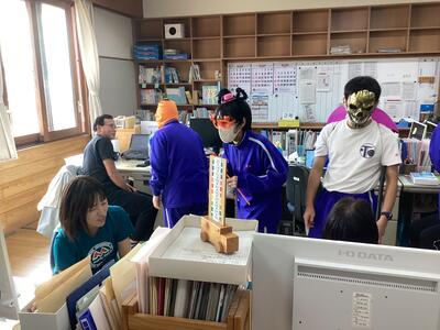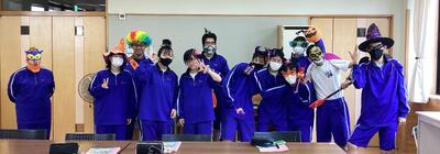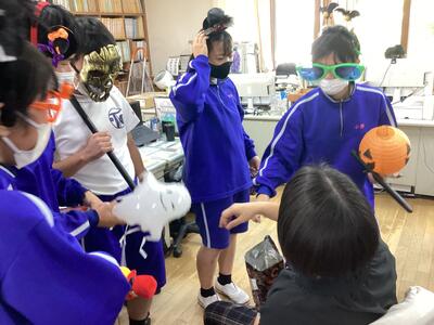 3年生の英語の授業では、ハロウィンについて学習しました。今回はそれぞれの生徒が仮装をして校内を歩きました。職員室や事務室で、「トリックor トリート!」とおなじみの挨拶をして、お菓子をいただく体験をしました。